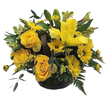 What a vibrant and cheerful arrangement! It features a beautiful mix of yellow roses, daisies, and lilies, complemented by fresh green foliage. The flowers are carefully arranged in a charming basket, exuding warmth and positivity. Perfect for brightening someone's day or as a centerpiece for any joyful occasion. Local Muskegon, MI florist. Family owned.