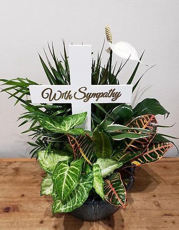 A perfect expression of sympathy featuring lush green plants of various shapes and patterns. At the center, there's a white cross with "With Sympathy" written in gold letters, adding a heartfelt and thoughtful touch. From your local Muskegon, MI florist.